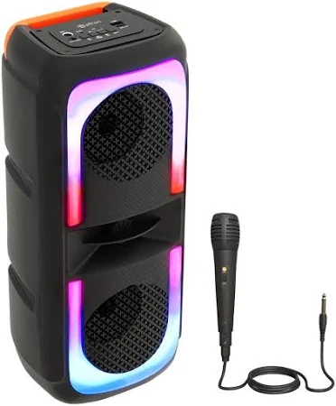 Portable, waterproof speaker with deep bass and 12-hour playtime.
